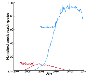 My TL:DR summary of the paper’s methodology is “we modelled MySpace’s growth and decline against the number of Google searches for MySpace, and then applied the same model to the number of Google searches for Facebook”.