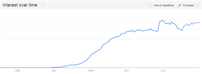 However, there’s a new problem. The decline thesis doesn’t really fit the data on Google searches for ‘Facebook’, which remain at 2011 levels and don’t show much of a declining trend at all (the dotted bit is Google’s projection; feel free to ignore everything after January 2014 if you’re sceptical):