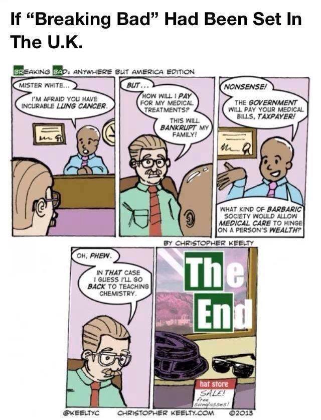 Now, if someone unemployed or casually employed (ie almost everyone from the subculture Walt visits after heading out on the meth-making trip) had gotten sick, that would have been a story where the outcomes were actually different in the US and the rest of the world…