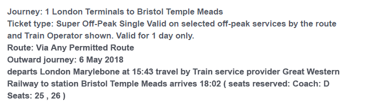 The outbound train is on an engineering works day, during which the usual GWR London terminus of Paddington is unavailable and Bristol trains are instead running out of Marylebone, half an hour’s walk away. This rather important fact was invisible when booking the tickets (which just showed up as ‘London’), and would be easy to miss given the way it’s glossed over in a big text block in the confirmation email. It’s easy to imagine someone showing up at Paddington to collect their tickets, only to discover a closed station and a frantic taxi ride through west London.