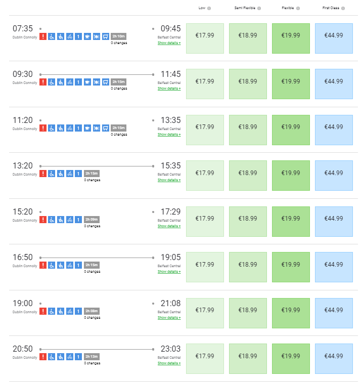 Irish Rail [4] [5] was a bit of a surprise, in that its train ticketing experience involved going back in time 25 years to an era before demand-based pricing was even a thing. There was no variance in price by day or time, all tickets are valid on any service, and the fares are remarkably low – so more first class action!