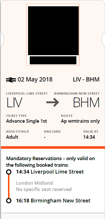 The best was Virgin Trains (West Coast) from Birmingham to London, with West Midlands Railway from Liverpool to Birmingham a close second. Virgin and West Midlands use the same website booking engine (Trainline, which Virgin used to own), with slightly different front-end skins. It works very well.