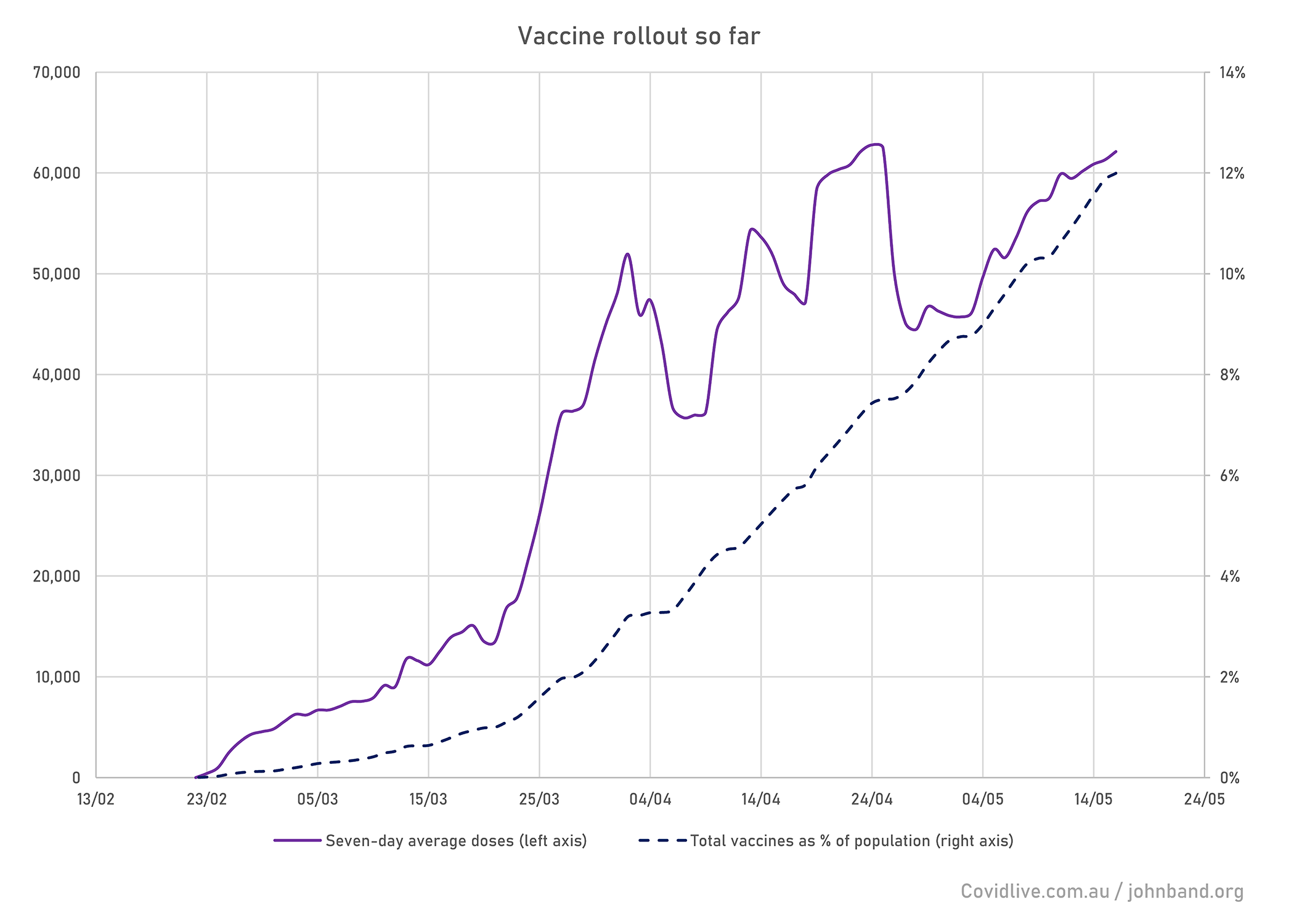 The rolling average chart shows a much better vaccine story for May, with the seven-day average consistently rising. More Pfizer doses have arrived from overseas, and the major states have set up mass public vaccination hubs. These are currently scaling up to provide high-capacity doses to anyone who can get there. Here’s your correspondent at one last week: