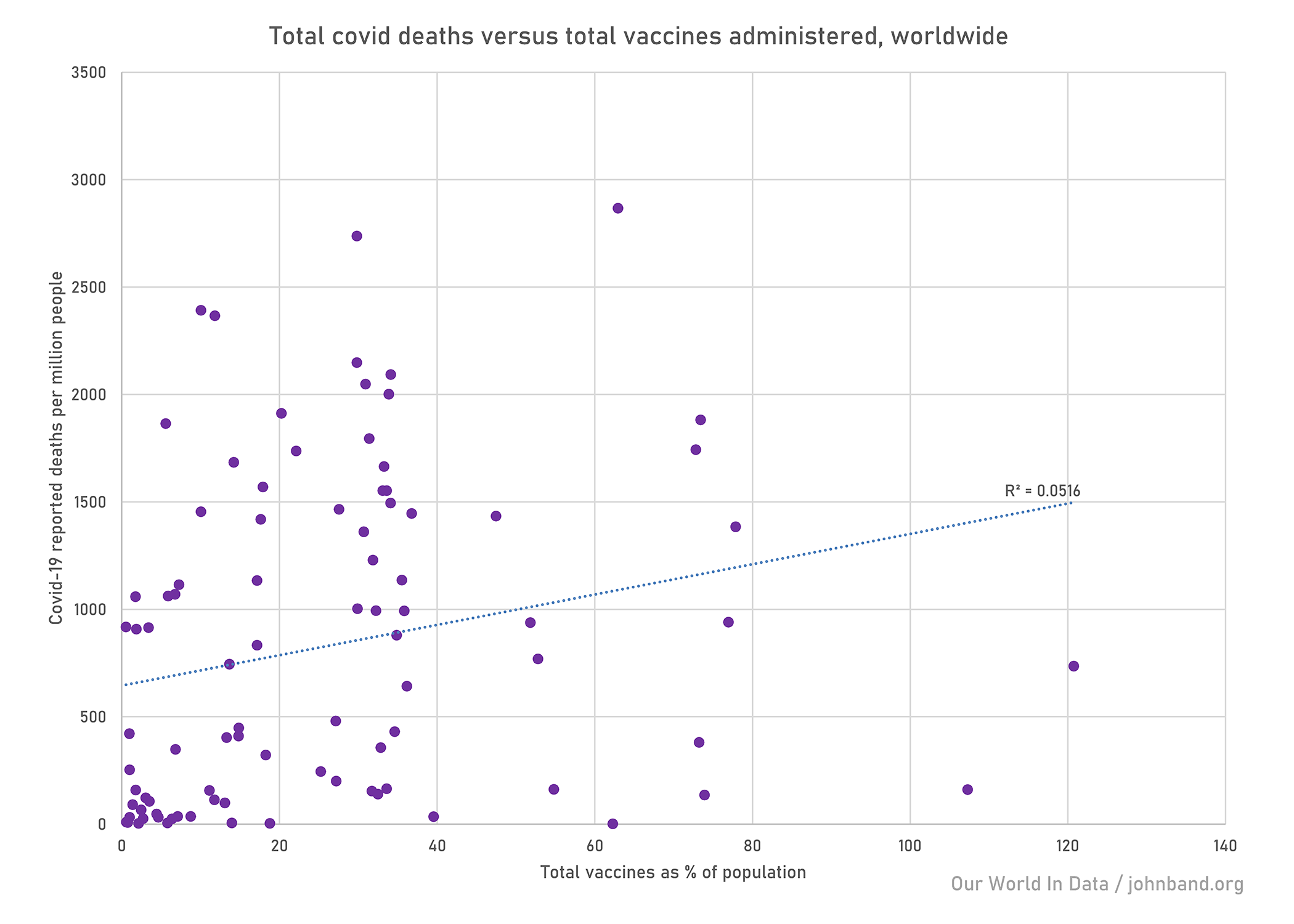 My inclusion of high-vax, high-death countries and low-vax, low-death countries in the previous paragraph wasn’t a coincidence. We aren’t alone in our lack of roll-out urgency. Here’s a scatter graph showing the world’s vaccine roll-out (doses per % of population) alongside covid deaths per million people. There’s a weak but visible positive correlation. People are more inclined to get jabbed (and governments more likely to arrange jabs) if the alternative looks like an unpleasant death than if unpleasant deaths are just a story on the world news.